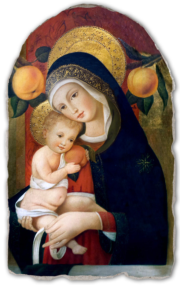 Questo affresco di Madonna col bambino di Carlo Crivelli (https://it.wikipedia.org/wiki/Carlo_Crivelli) è uno dei prodotti più apprezzati dal pubblico e la sintesi perfetta del modo di lavorare della Bottega Tifernate di Città di Castello. L’affresco viene preparato con calce spenta e sabbia seguendo le procedure di epoca rinascimentale. I colori utilizzati sono a base di ossidi, quindi molto duraturi alle sollecitazioni ambientali, a garanzia di una lunga durata nel tempo. La riproduzione dell’opera d’arte viene realizzata tramite una tecnica brevettata dall’azienda e denominata pictografia. Successivamente l’opera viene ritoccata per conferire la profondità e la brillantezza tipiche di un dipinto originale. Lo spessore sulle opere viene realizzato a mano con gesso a caldo e colla naturale. La doratura viene eseguita esclusivamente con foglia oro 18 kt. e foglia oro zecchino 24 kt. Il Certificato di Provenienza abbinato all’opera, attesta l’originalità dell’opera; la data di realizzazione permette di risalire al periodo della lavorazione. Al Certificato, viene abbinata una spiegazione sintetica della tecnica. Infine l’opera viene confezionata in una scatola bianca inserita in una cornice di gomma piuma e velluto, corredata di gancio a scomparsa e cavalletto in ferro pieghevole da appoggio